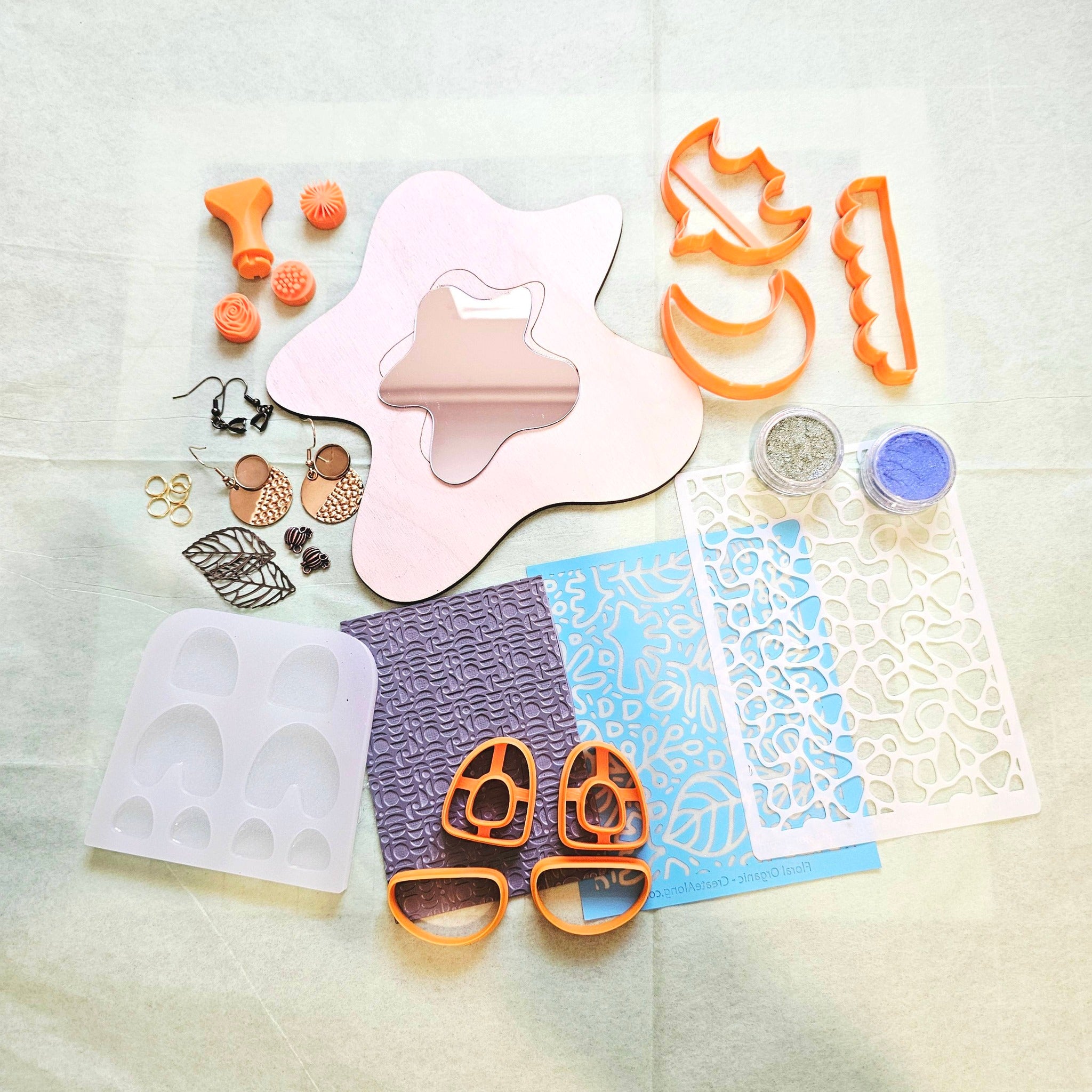 This box includes our surface pattern tools of the month, plus a set of earring cutters, findings, and a mold you can use with liquid clay, polymer clay, UV resin, and more.