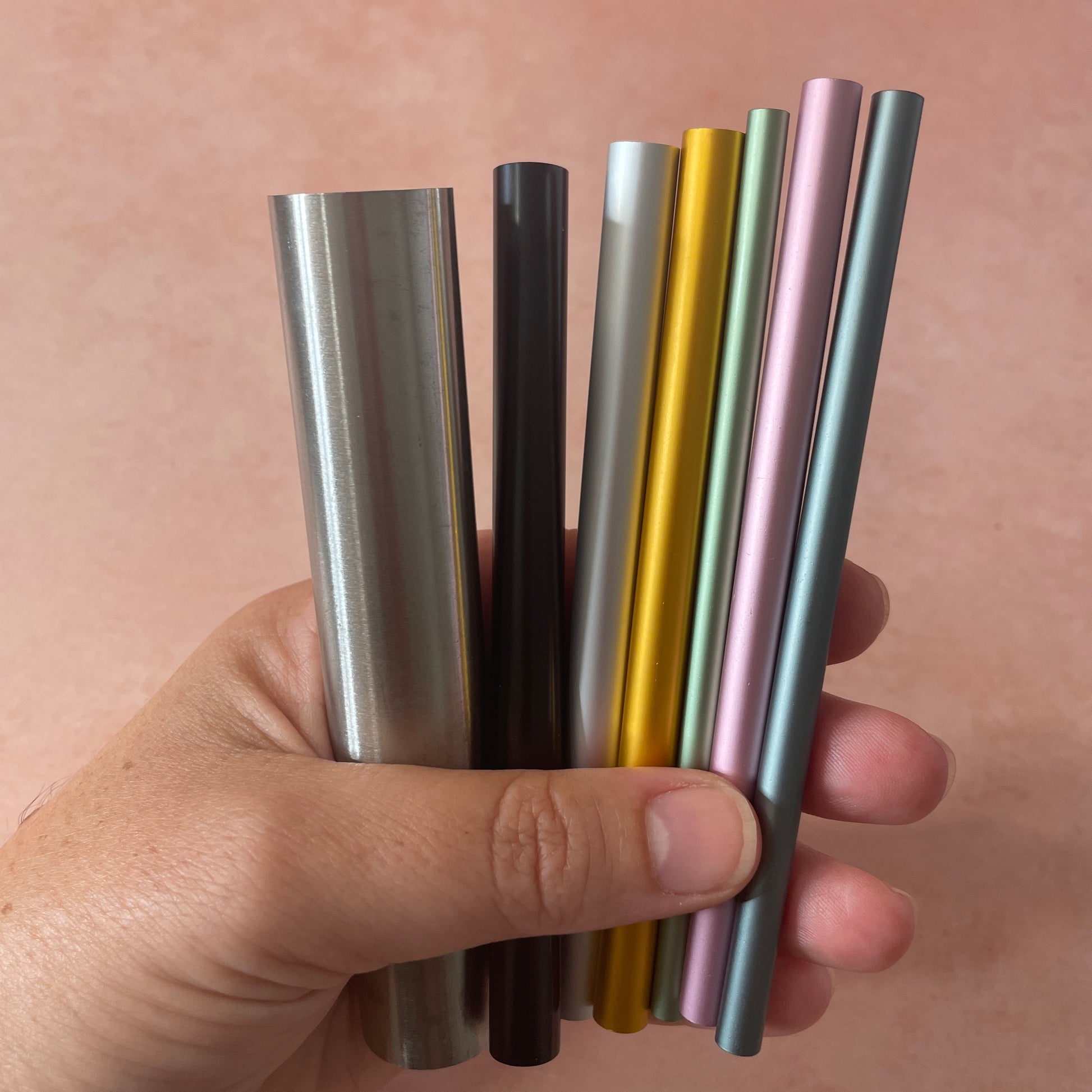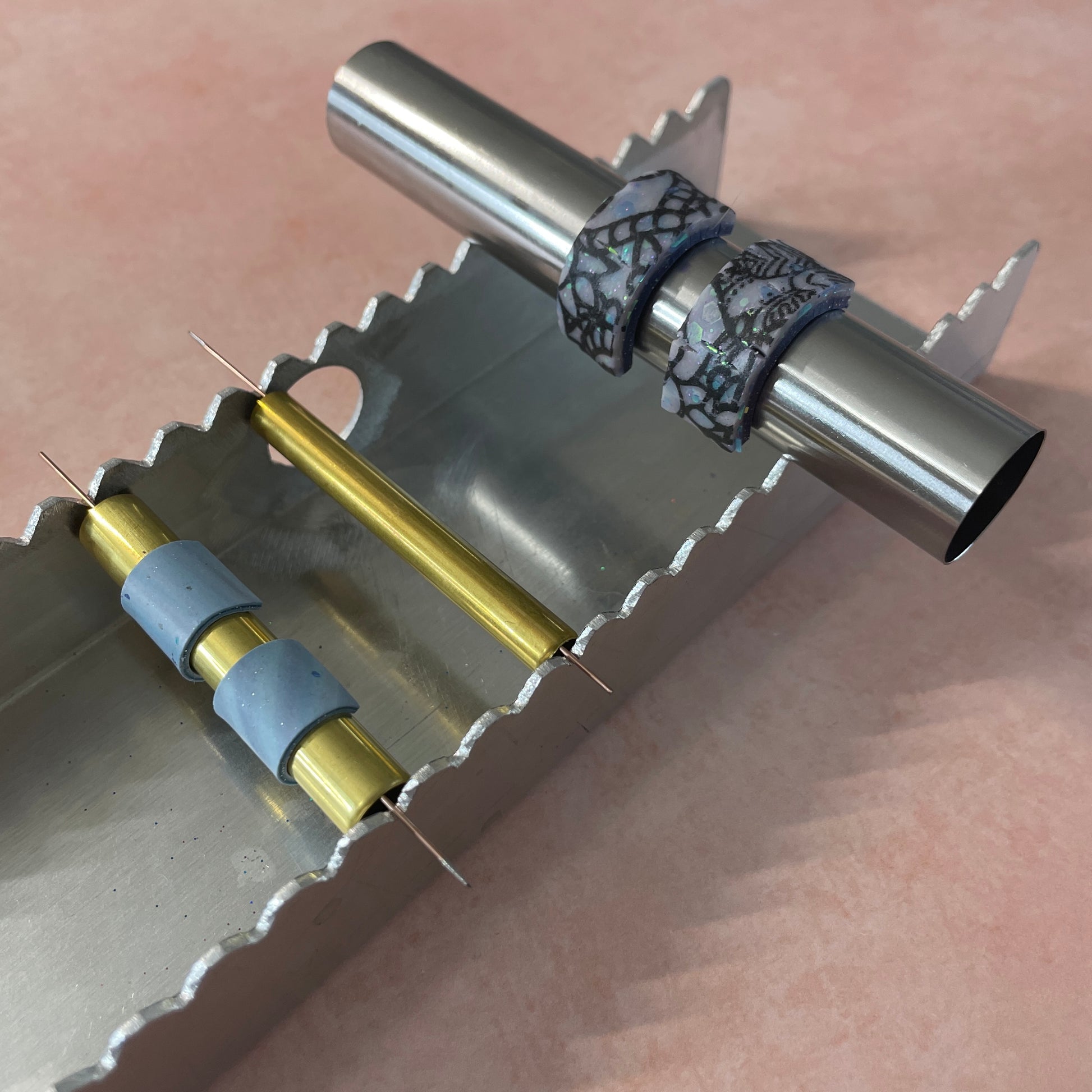 The large silver form is also pretty amazing to use to roll your clay flat! Use these to prop forms for baking, wrap your earrings around them to make "Huggies," make hair twists and wine glass stem twists, and so much more! Bake on the tubes and pop the clay off after cooling. Because of the design of our bead baking rack, you can even put these on the rack to bake or work (seal, glitter, paint, and more on the even surface that holds the tubes!) Rack not included, find in another listing.