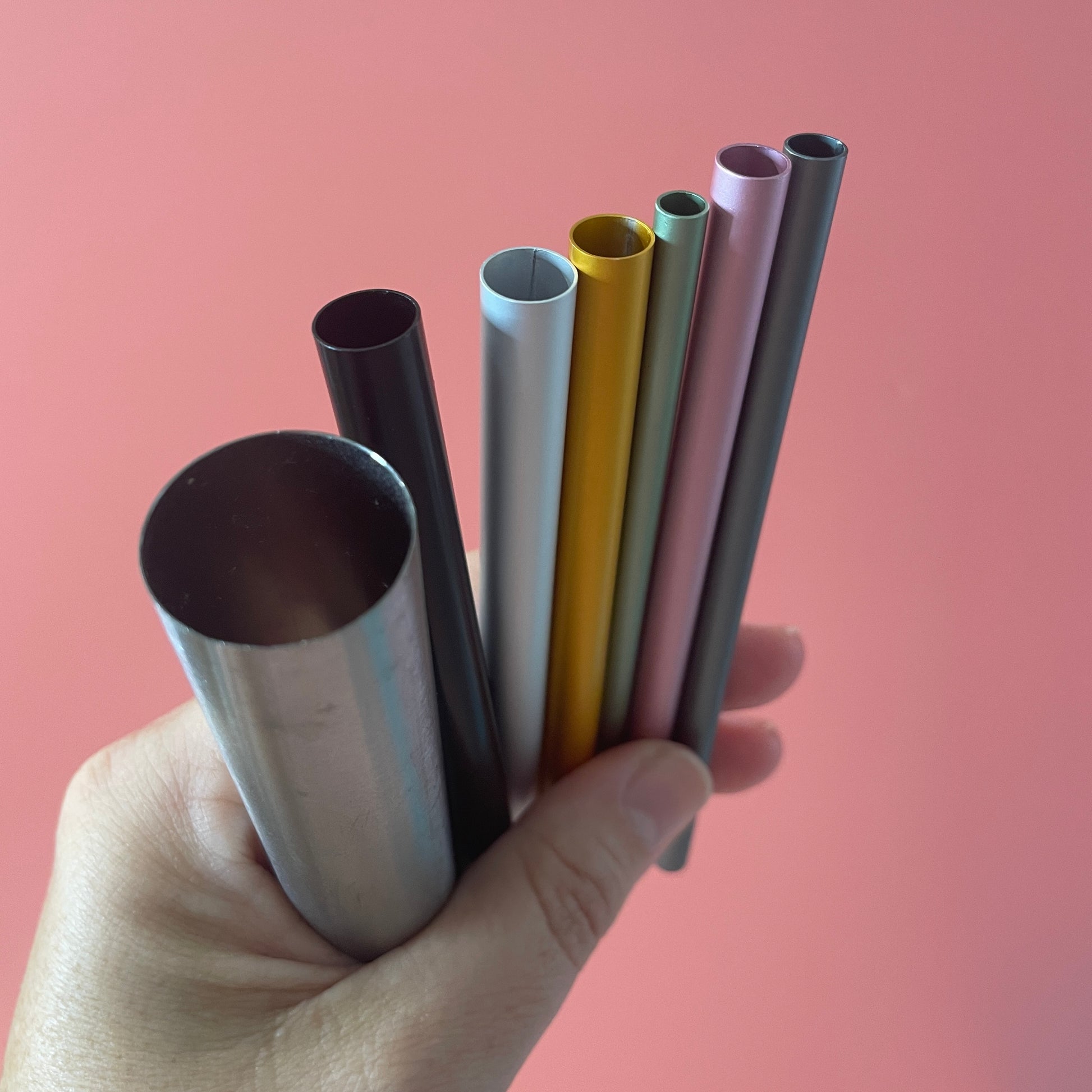 You will receive 7 metal tubes - 7/8" silver, the other 6 start at 3/8 inch, and each is slightly smaller than the last, the are able to nest together. 10, 9,8,7,6,5,4 mm.