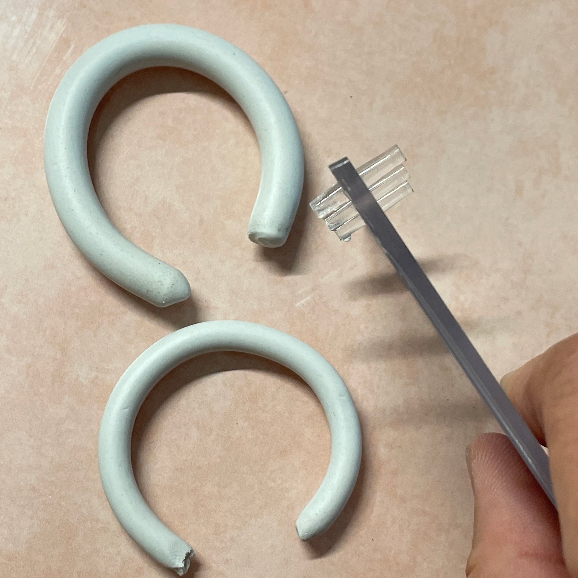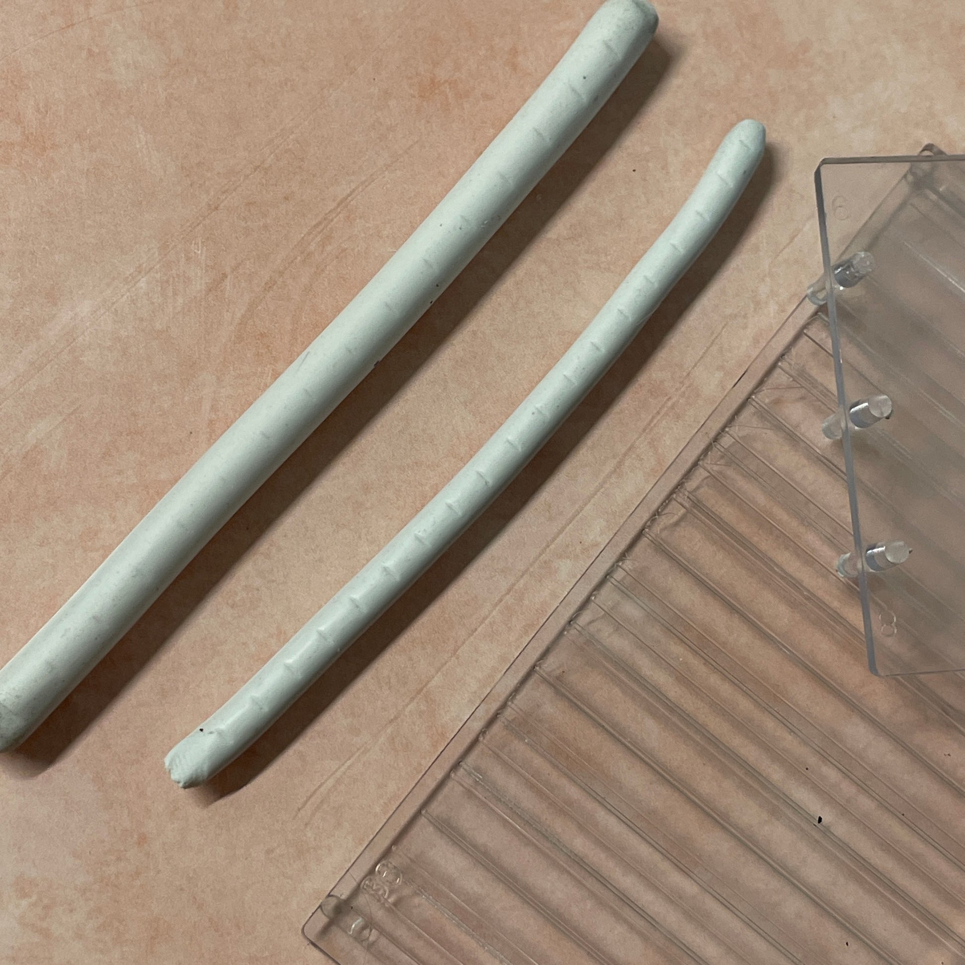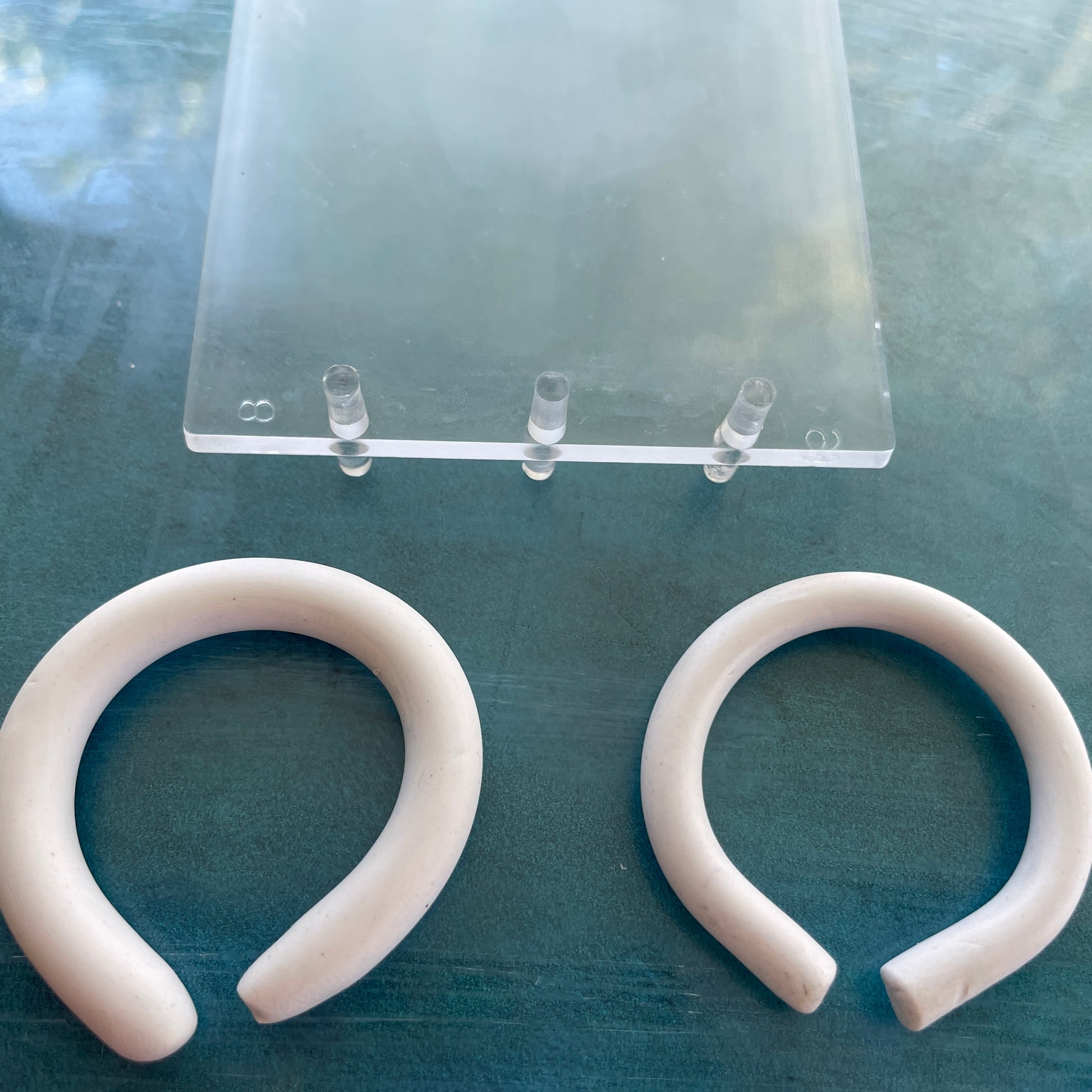 Set of 2 pieces. One measures and makes perfect 6 mm or 8 mm thick "ropes" of clay. How to use: the "legs" are 6 or 8 mm long, and you put your log of clay under the plate and roll it to produce a smooth lump-free clay snake.