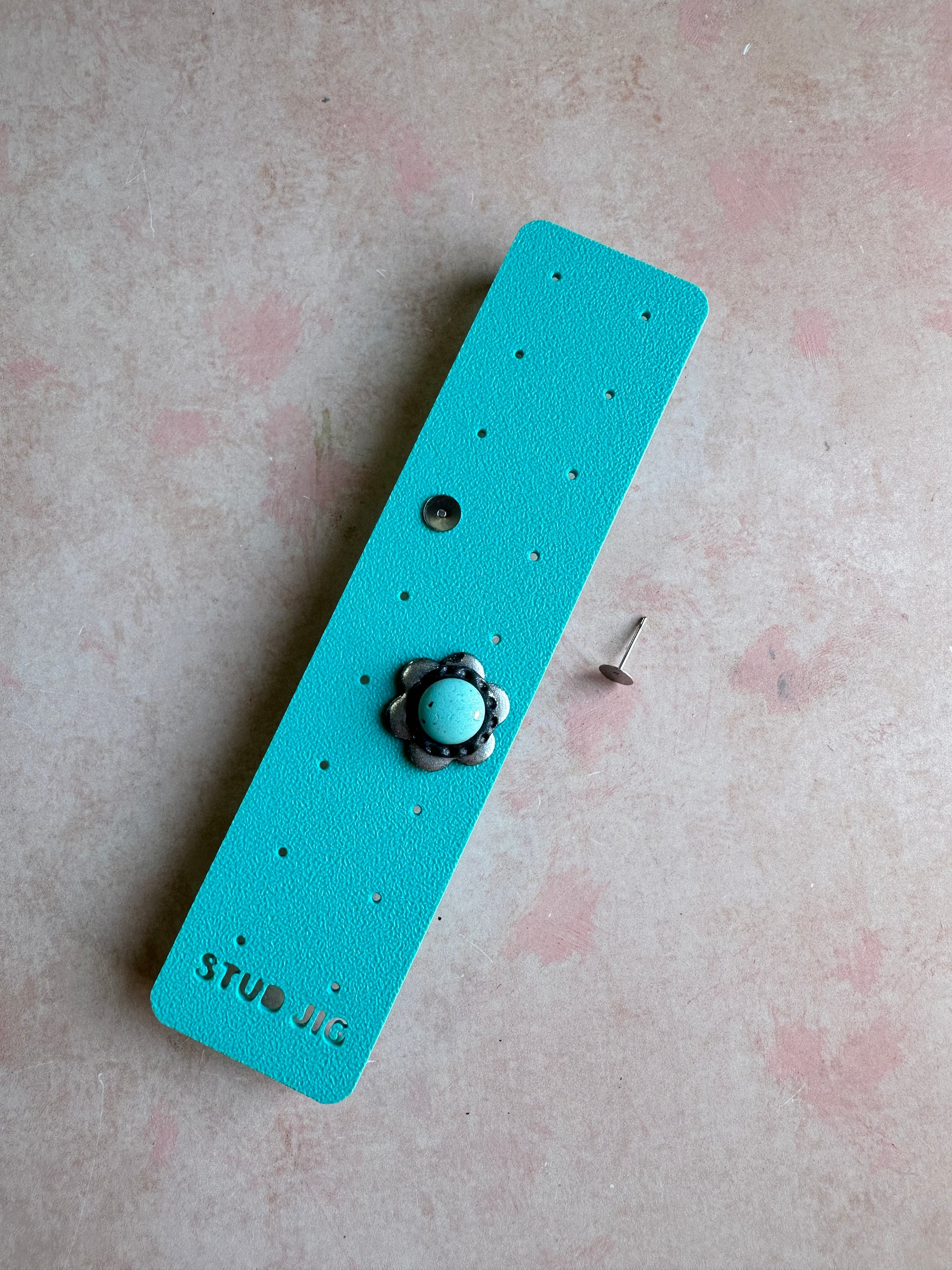 Now you can create clay stud earrings in one baking session with our turquoise bake-able stud jig. The turquoise one can go into the oven with your earrings right on it. Then you can use it to support your earrings while you decorate, seal, or add UV resin to the fronts.