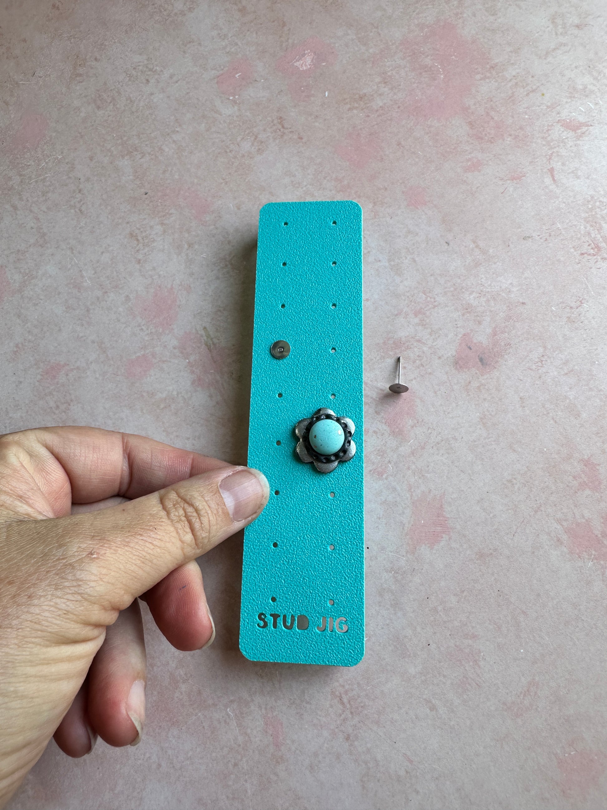 You can assemble and bake your polymer clay stud earrings properly on our jig! Just embed your post in the back of your clay, finish the back nicely, place the stud into the jig to support the earring while baking, and place on a tile in the oven for the recommended time and temperature for your clay.