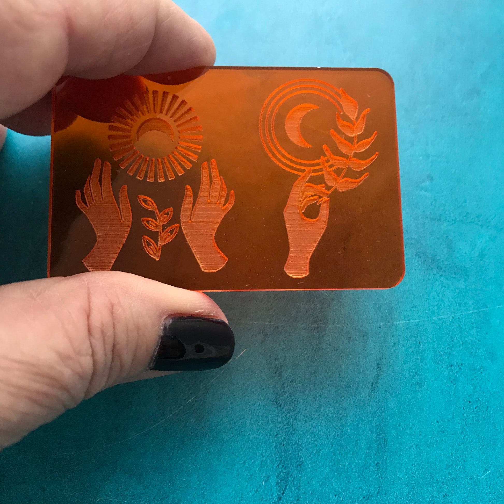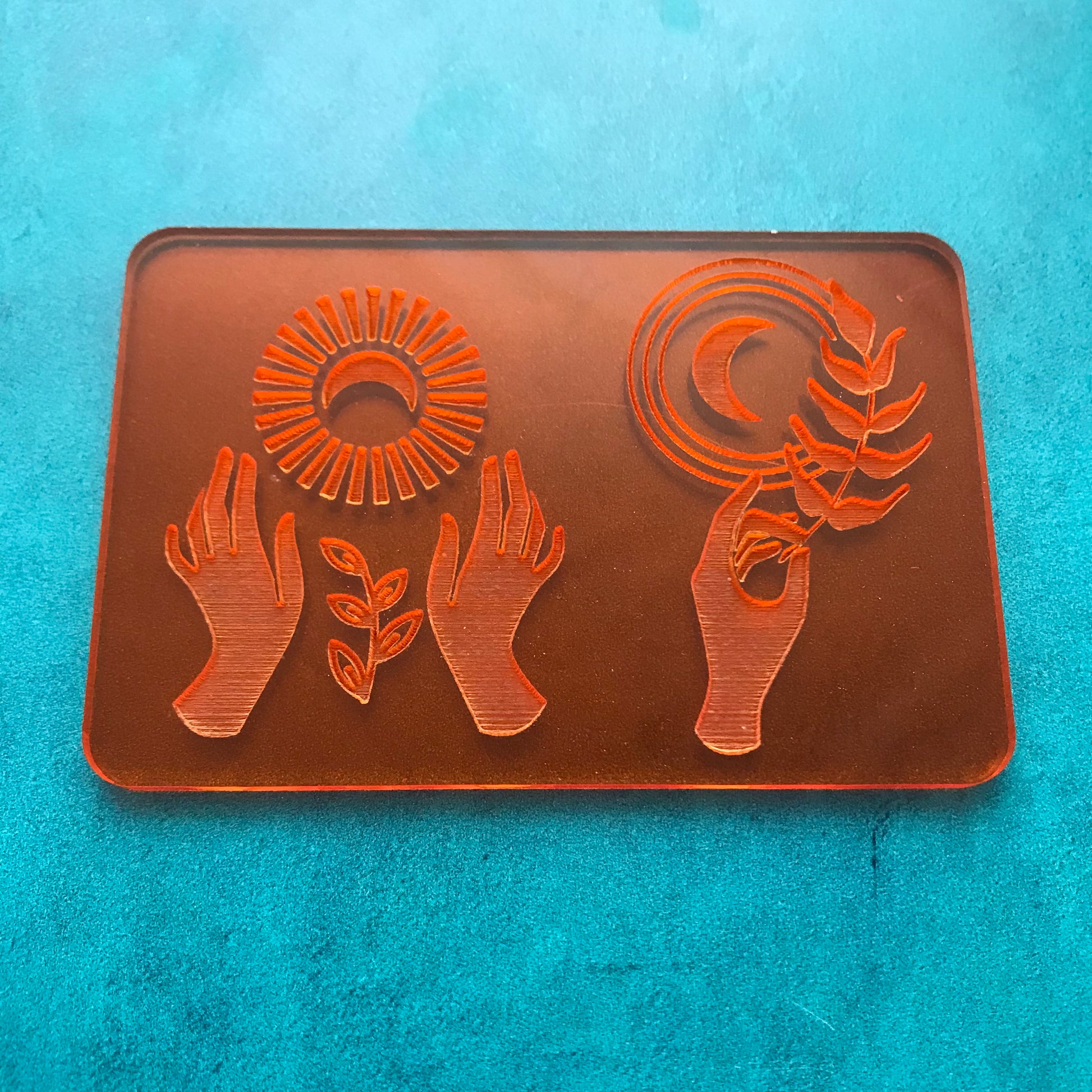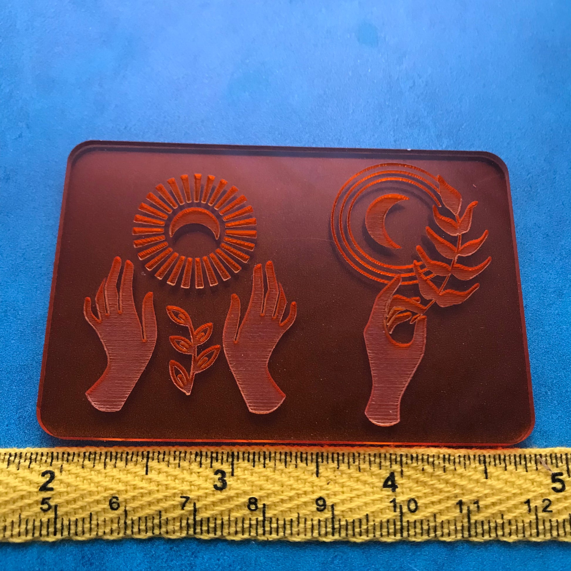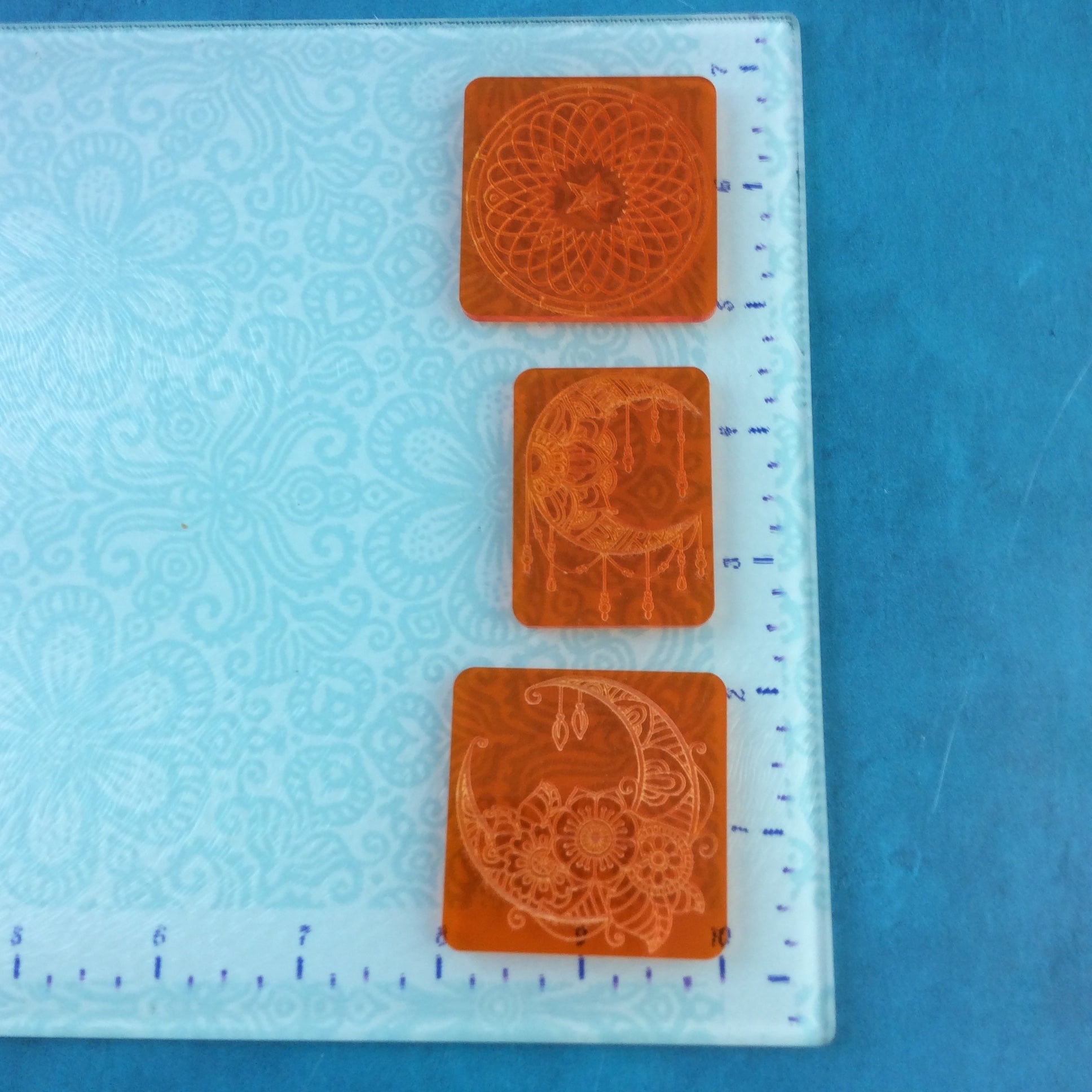 An image is etched into the disc and you can reveal it by pressing and releasing your sheet of clay creating a low-relief impression. Great for use for polymer clay projects, art jewelry, mixed-media, and even with gel printing plates for unique effects. The backs of these acrylic discs are flat and shiny- they make a perfect tool for reducing canes without waste.