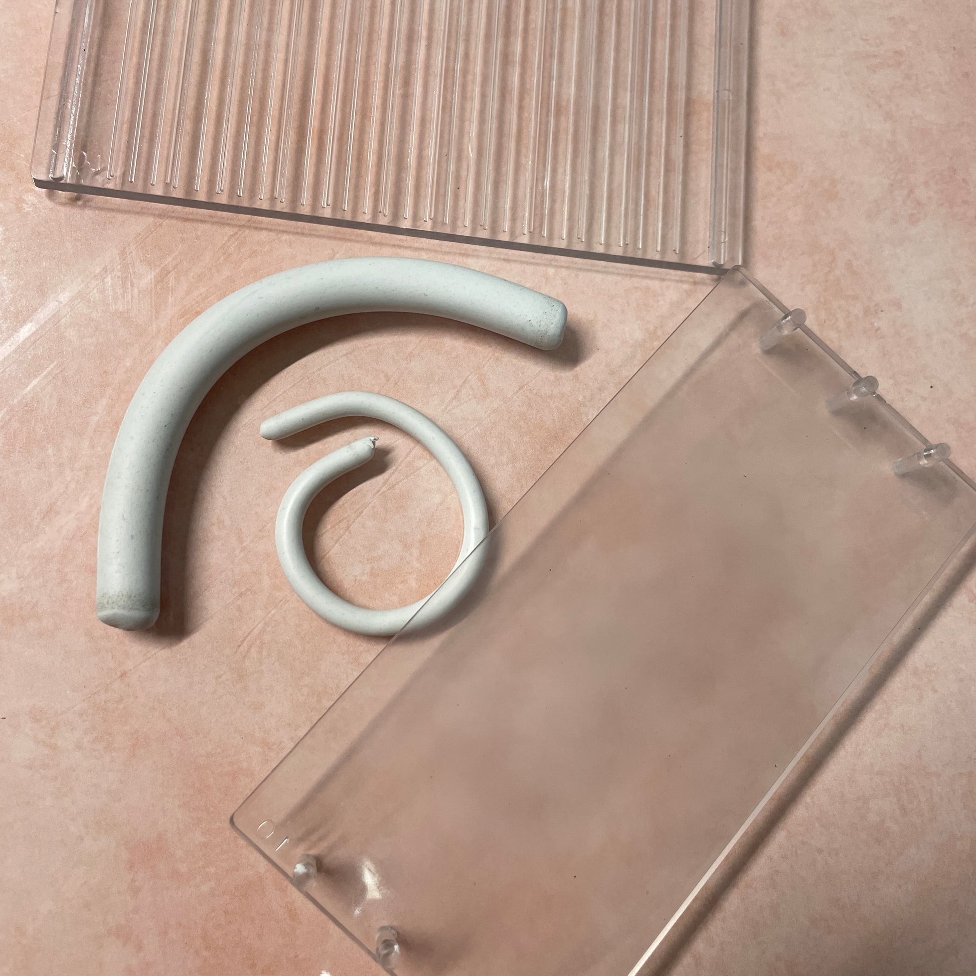 Set of 2 pieces. One measures and makes perfect 4 mm or 10 mm thick "ropes" of clay. How to use: the "legs" are 4 or 10 mm long, and you put your log of clay under the plate and roll it to produce a smooth lump-free clay snake.